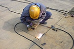 某病院増築工事において、引き渡し間際の敷鉄板返却に絡むつなぎ目のフラットバーの撤去作業を行なっています。一般駐車場が近くにあり、サンダーによる鉄粉飛散防止のため、養生しながら作業しています。
